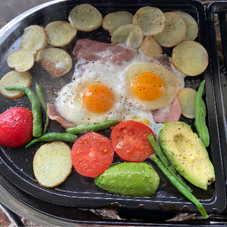 It has been a while since I used my customized Coleman gas grill. I changed the gas cannister to allow the use of portable gas cannister that are sold at the supermarket. I cooked both dinner and break using the grill. For dinner I used a cherry wood block which add a smoky flavor to the fish, veggies and chicken Tikka. For Breakfast I used the option cooking plate for cooking eggs, bacon, potato, tomato and avacado. See the photos below.